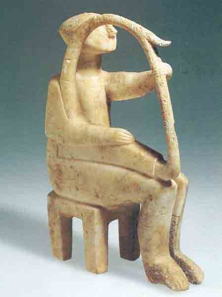 Rapt in his music, this ancient musician tilts his head toward the sky. Found on one of the Greek islands known as the Cyclades, the delicate figure (measuring only 14 inches high) was carved from local marble almost 4,500 years ago. Working with exceptional skill and patience, the Cycladic sculptor captured the musician between notes—the harpist’s right arm rests on the instrument’s sound box while his left encircles the harp’s frame. An abstract swan’s head decorates the top of the harp, an ornamental motif that continued in Greek and Etruscan art until the early fifth century B.C. Although the ancient meaning of the sculpture remains unknown, the discovery of a similar harpist and numerous other sculptures in Cycladic graves suggests they were made as funeral offerrings.