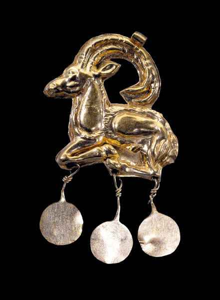 This elegant, 2-inch high Minoan gold pendant depicts a Cretan wild goat, also known as the agrimi or kri-kri. The goat, with its distinctive long curving horns and powerful muscular frame, is shown in profile with its legs neatly tucked beneath its body. The piece, which dates to the 17th century B.C.E., is adorned with three dangling gold discs and has a suspension loop atop the horns, which suggests it was intended to be worn as jewelry.