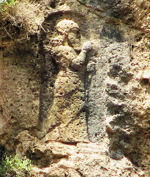 This photo was taken some months ago on the slopes of Mt. Cudi near the Turkish village of Sah. The figure, who has not yet been identified, dates to a period earlier than Sennacherib (who ruled 705–681 B.C.); there is no accompanying inscription. He has his right hand raised in a gesture of reverence and holds a staff of office in his left hand.